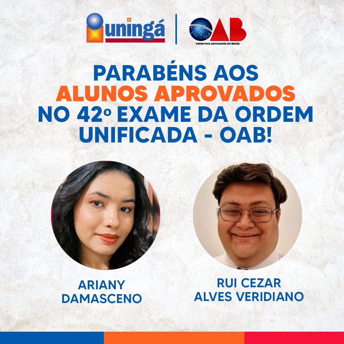 O curso de Direito da UNINGÁ obteve duas aprovações no resultado definitivo da 2° fase (prova prático-profissional) do 42° Exame de Ordem Unificado (EOU) com a classificação de Rui Cezar Alves e Ariany Damasceno. Ambos, estudantes do 5° ano já se mostram preparados para os desafios do mercado, conquistando o requisito necessário para a inscrição nos quadros da Ordem dos Advogados do Brasil (OAB); ainda no período de formação.