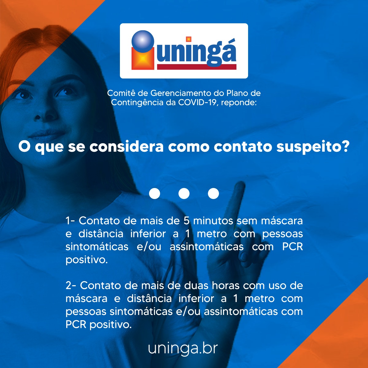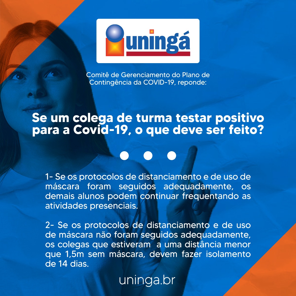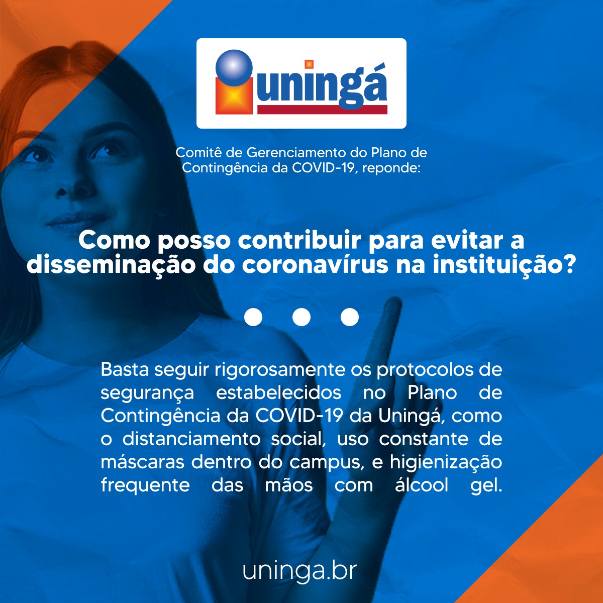 A Uningá trabalha para assegurar a segurança de seus acadêmicos e colaboradores a todo momento, por isso, foi elaborado com um corpo de especialistas o Plano de Contingência a Covid-19, a fim de evitar qualquer disseminação do vírus no campus.